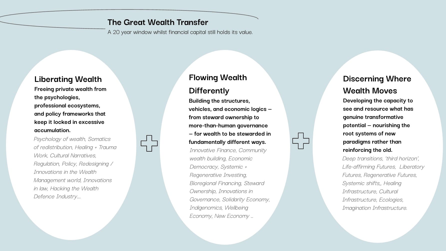 I have spent significant time in the third pillar — the work of discernment, imagination, resourcing emerging futures and the invisible infrastructures for transition — through my years in philanthropy and systems change practice. Now I am primarily focused on the first: the liberation of wealth from the structures, psychologies, and professional ecosystems that keep it stuck. This is where I believe the greatest leverage currently lies — not because the other pillars are less important, but because without the first move, a critical mass of people with concentrated resources, the others cannot operate at the scale this moment demands.